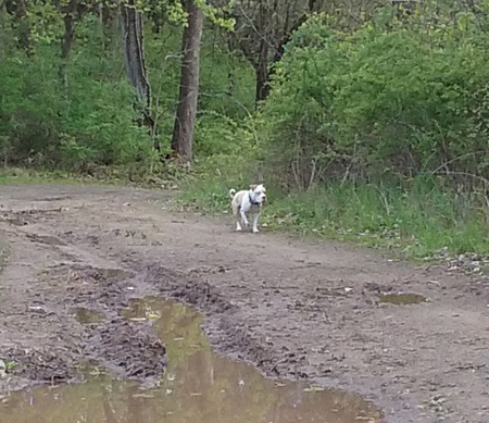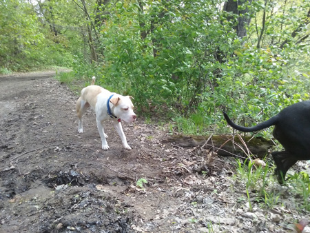 Though it wasn't especially warm today (at least by May standards), at least there was sun for long stretches at a time. It made me think I should start the garden. But there's a large swath of it in the "cabbage" patch that needs to be tilled and covered with fresh new soil, since its present surface is a minefield of ashes, compost, and dog turds gathered from throughout the yard over the course of the winter. But to harvest the necessary soil would require the Subaru, which I've pretty much mothballed since its clutch began failing in earnest. But it was such a beautiful day that it insinuated itself into my attitude as optimism, and I decided to risk it. Getting to my usual set of topsoil mines (on the natural levee of the Esopus just across Wynkoop from the Hurley Mountain Inn) was easy, since it was all downhill. Before doing any mining, I first took both dogs (now we're down to just Neville and Ramona) on a brief walk in the field to the north. Their snuffling among the thick bushes between the local farm road and the creek scared up at least one little rabbit (though only I seemed to notice). I snapped a few pictures.