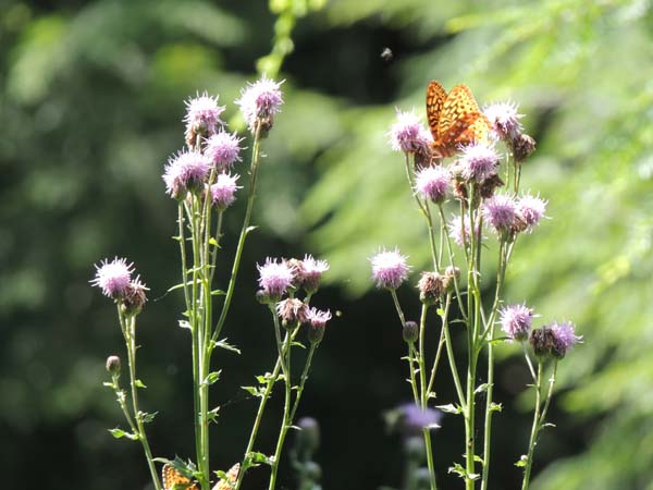 Butterflies (or maybe skippers) on thistles growing in the beaver dam at the Woodworth Lake outflow.