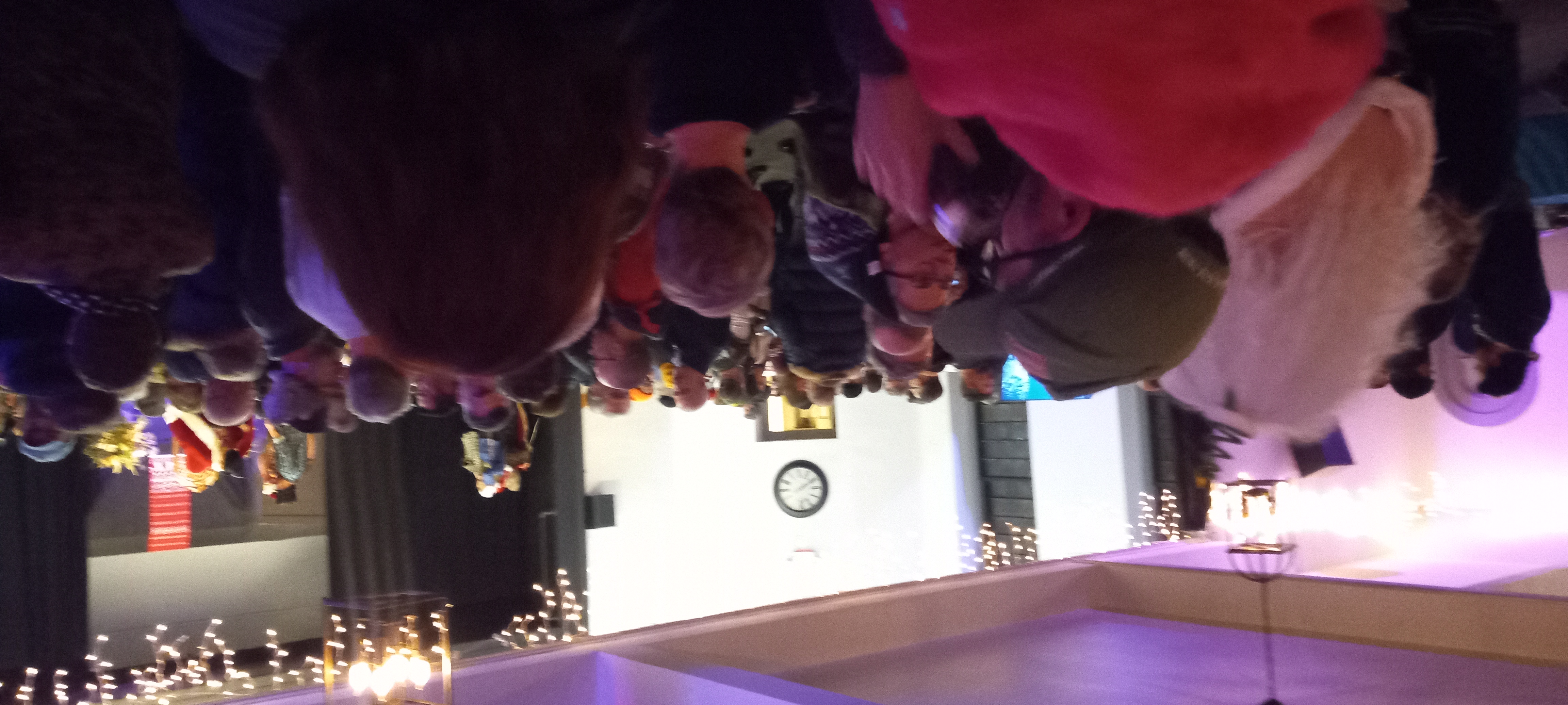 The scene in the festive pre-show area. Santa and friends are on stage in the distance.