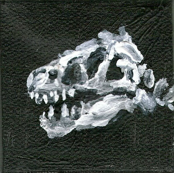 Another thing I did today was to paint a tiny (two inch square) black-and-white painting of a Tyrannosaur skull.