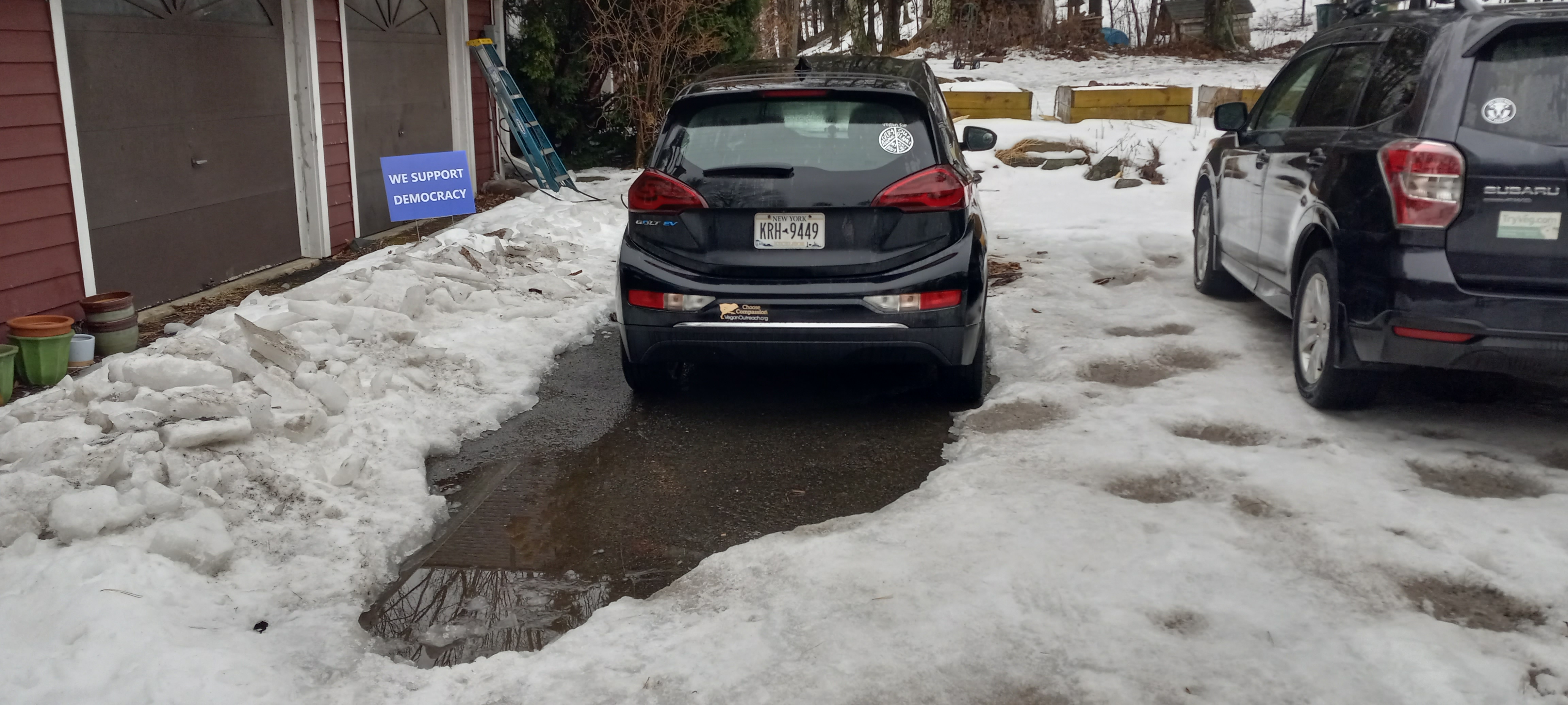 The state of ice in our driveway this afternoon. Also, it says something about the state of democracy when people are displaying signs such as this. Click to enlarge.