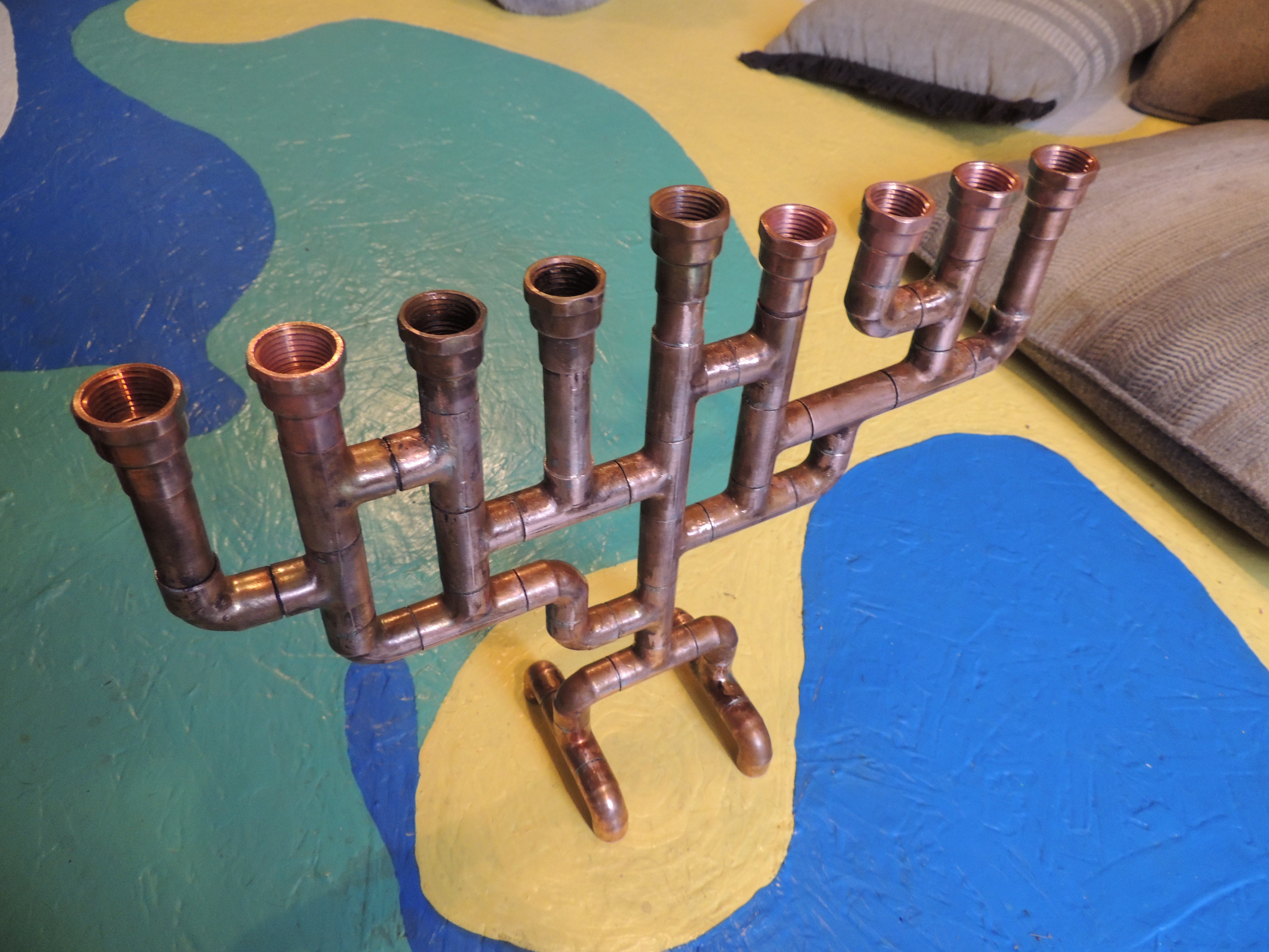 Every Hanukkah, Gretchen's childhood friend Dina proudly show off (in her house and on Instagram) a menorah I made for her, probably as a present for her 2005 wedding in Tel Aviv. This year, an Instagram post garnered enough attention for me to make a website selling the things I make from copper pipe. Since then, I actually got a customer, someone wanting a menorah of design #2 (the designs are numbered on that website). But then I had to drive to Rochester to do landlording, drive to Staunton to attend the death of my mother, and then vacation in sunny St. Petersburg, Florida. Today, though, the plan was to make that menorah. So I took a recreational 150 mg dose of pseudoephedrine and started going through my bucket of half inch parts to find all the elbows and Ts I needed.