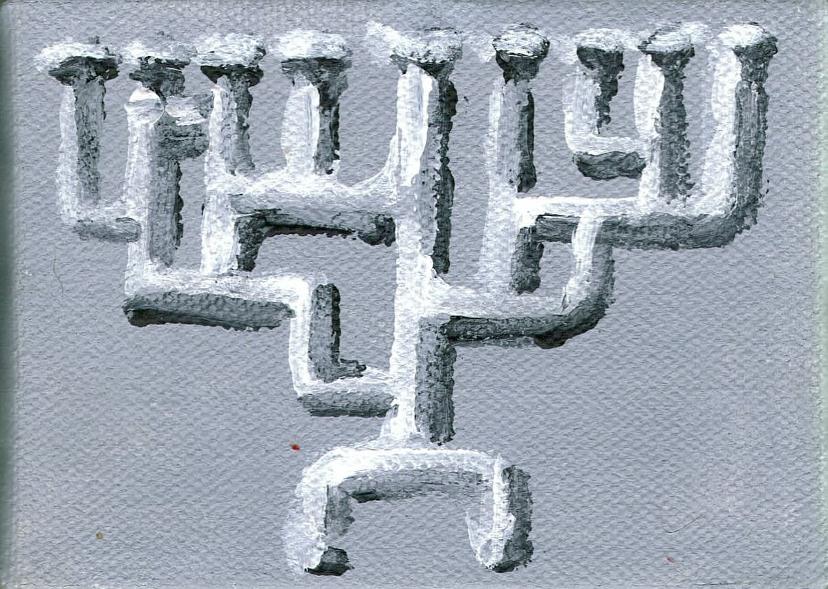 When I was packing up the menorah to ship (using a large insulated box that had been used to ship us faux meat from Blackbird Foods), Gretchen had suggested I include a card for my "business." So I made what was probably the worst business card ever using a highly-solarized color-inverted image of one of my menorahs printed on a piece of card stock (technically it was that light-yellow paper used in Braille typewriters, one of which I inherited from my mother). I thought a better basis for such a card might be a painting of my reticulate menorah on a tiny canvas. So today I painted just such a painting.
