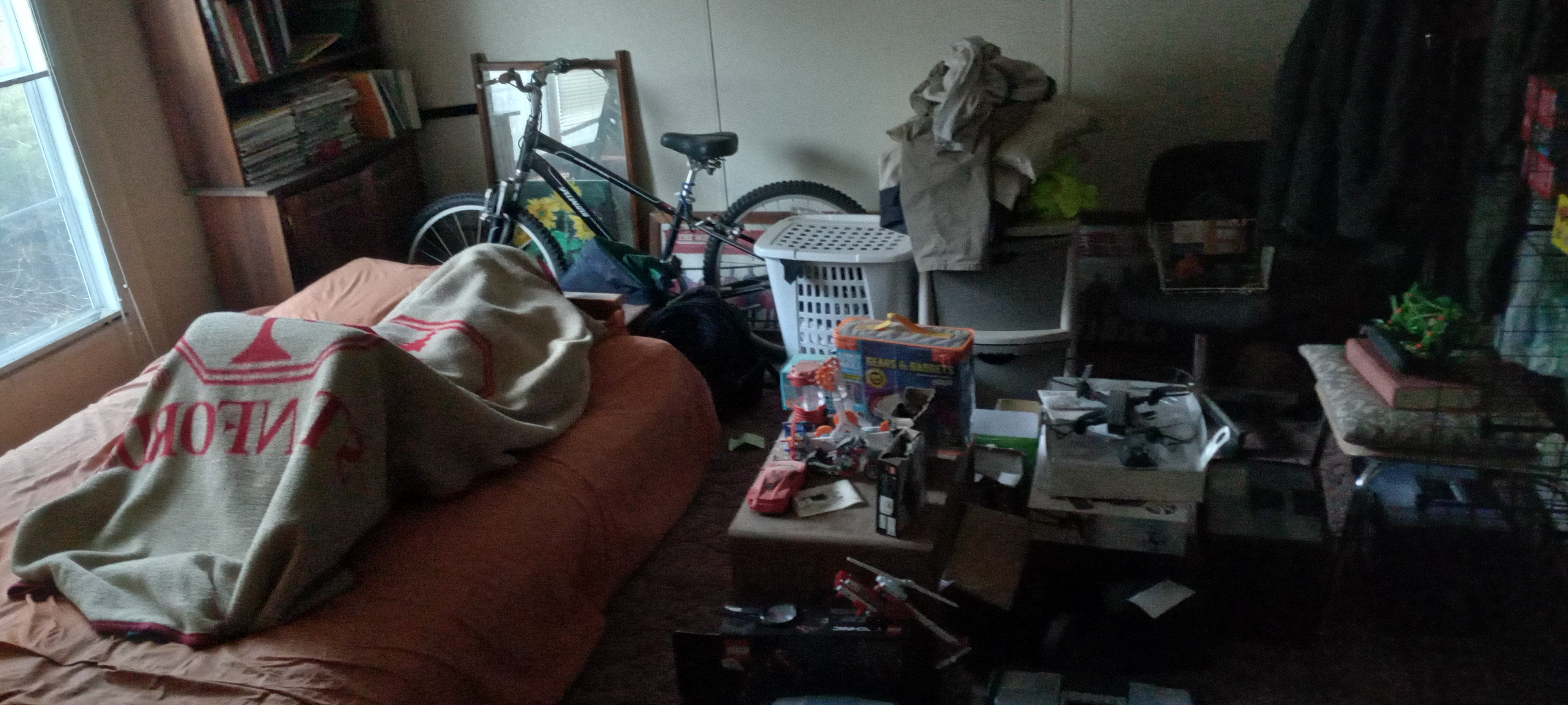 When I awoke again this morning, it was a little after 7:00am. The plan was to take care of any biological needs that I had, move my few remaining things (like my laptop computer and some food) to the Forester, and then begin my long drive back to Hurley. After eating a peanut butter sandwich and taking my last open-air crap of this trip (and using cold water from Folly Mills Creek as a stand-in for toilet paper), I carried a my stuff to the car and then went into the Creekside trailer to retrieve stuff I'd put in one of Don's two nasty little refrigerators (which are mostly full of orange juice and a Liquid Death flavor Don had bought and decided is undrinkable). Don was still in bed, completely covered by a blanket. Strangely, he was sleeping on his back with his knees up. As I was snapping some pictures of this strange scene, he pulled the covers off his head and I could tell him goodbye, wishing him well as "Lord of Creekside."