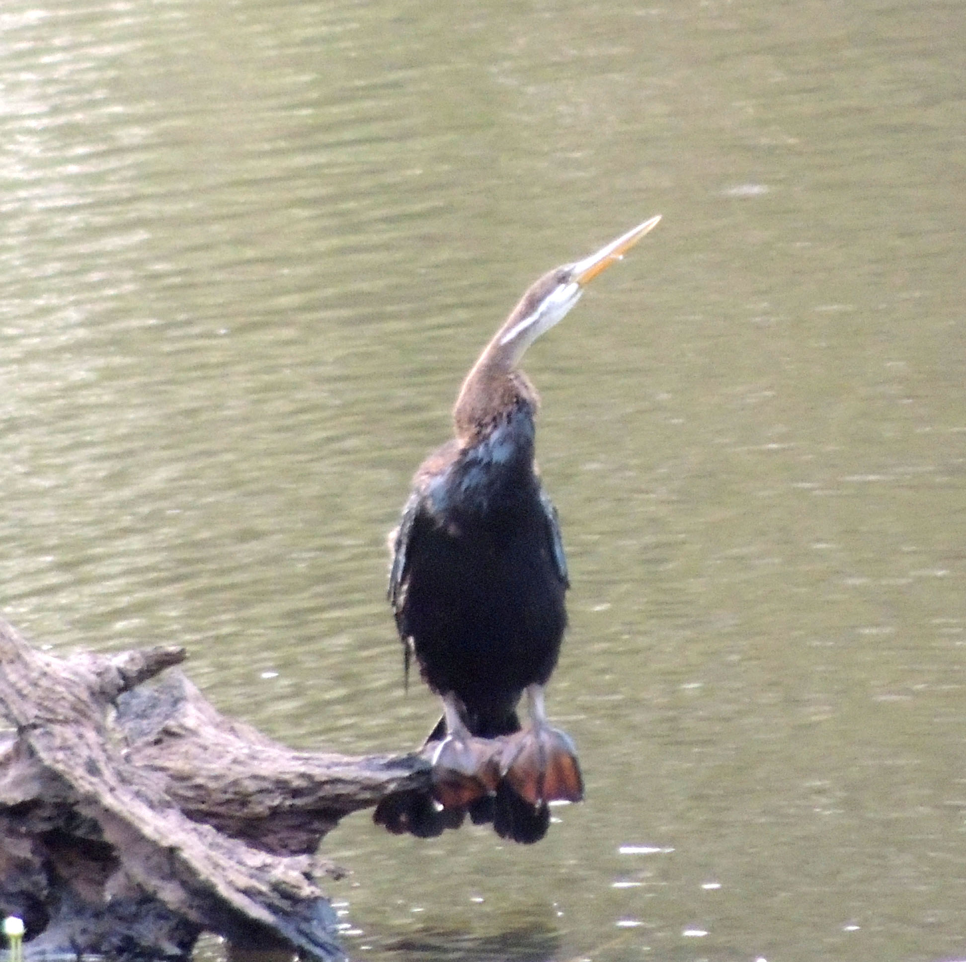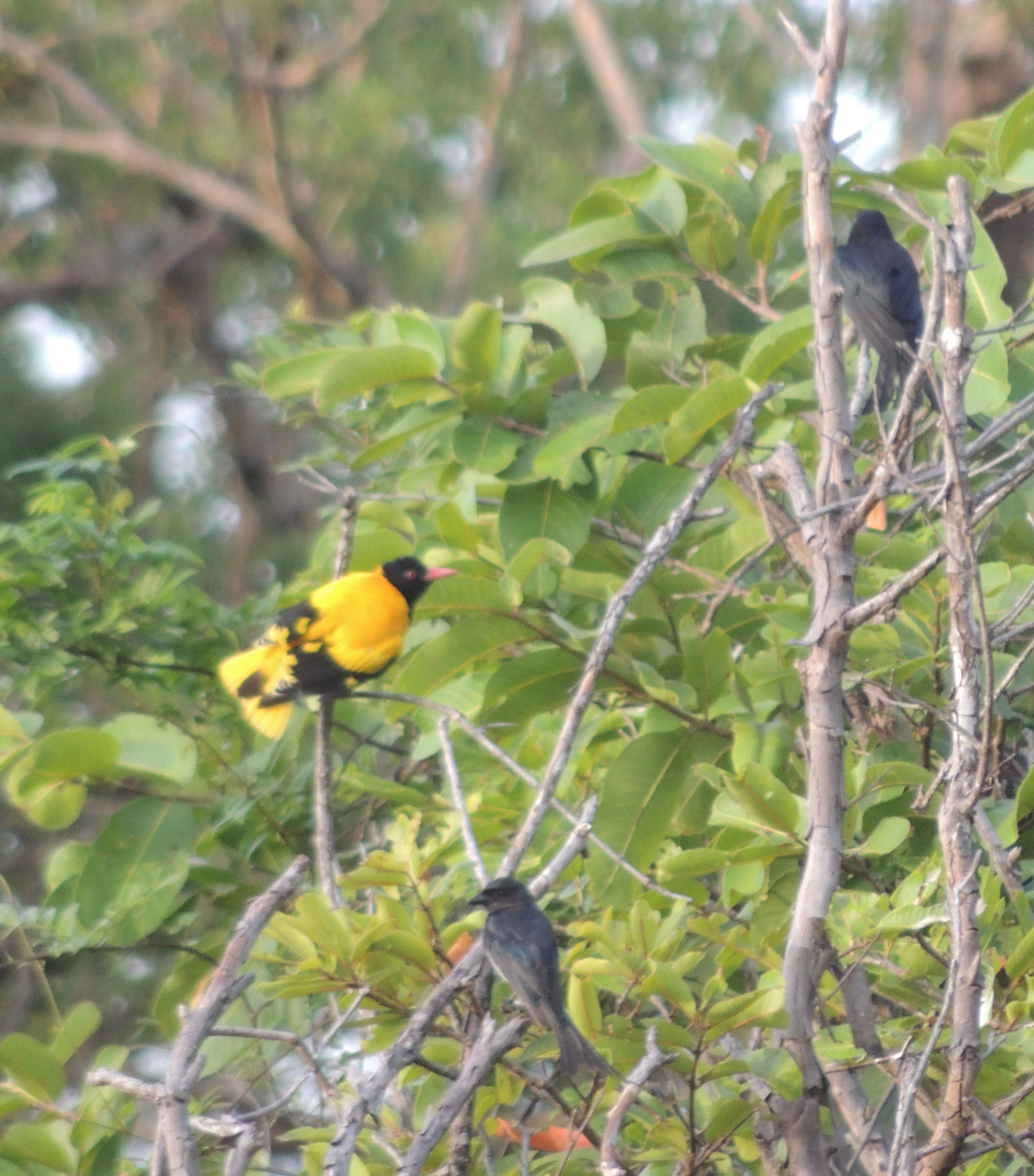 A black-hooded oriole with two white-bellied drongos above Habarana Lake. Click to enlarge.
