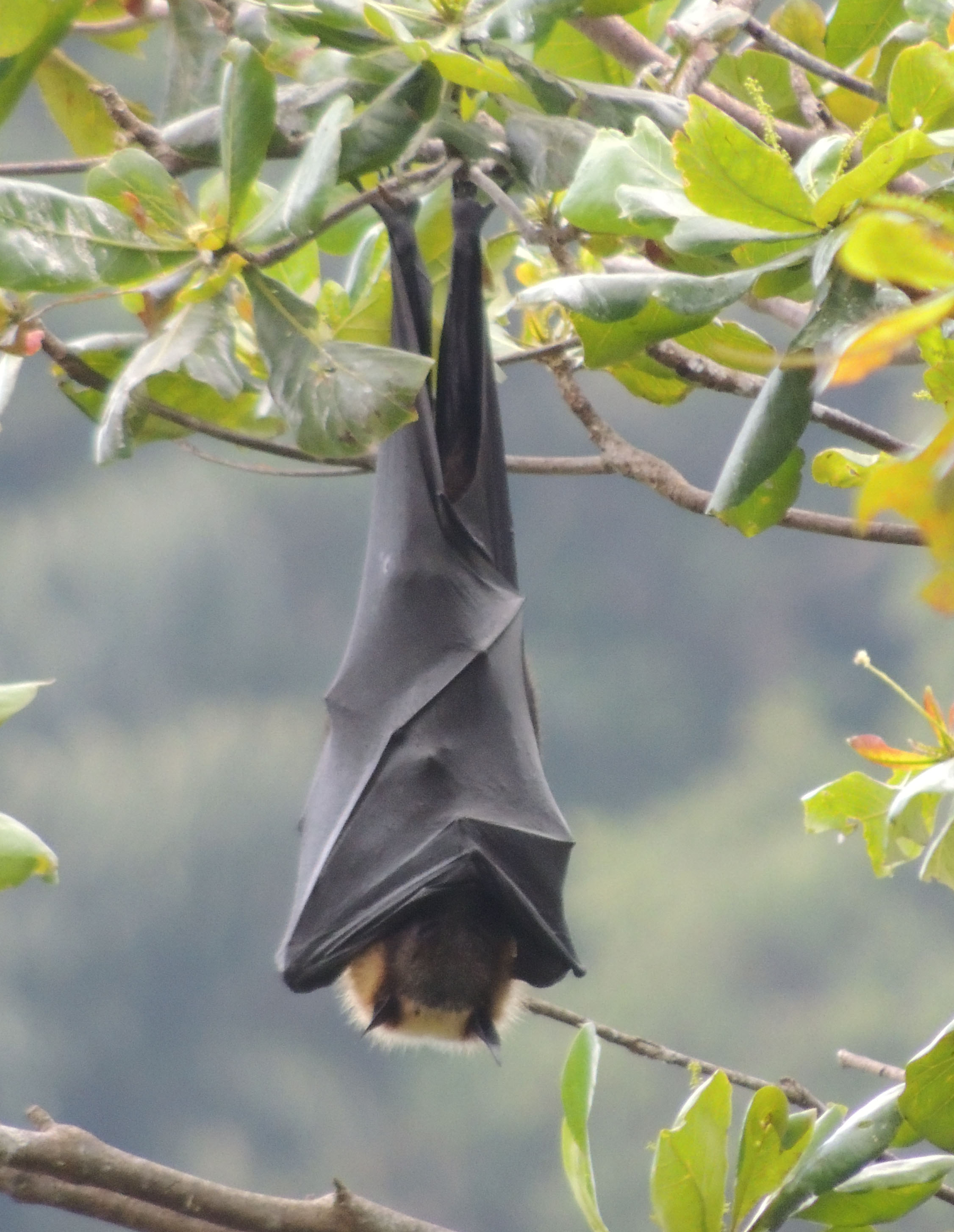A roosting fruit bat wrapped in his or her own wings near the Hotel Suisse pool. Click to enlarge.