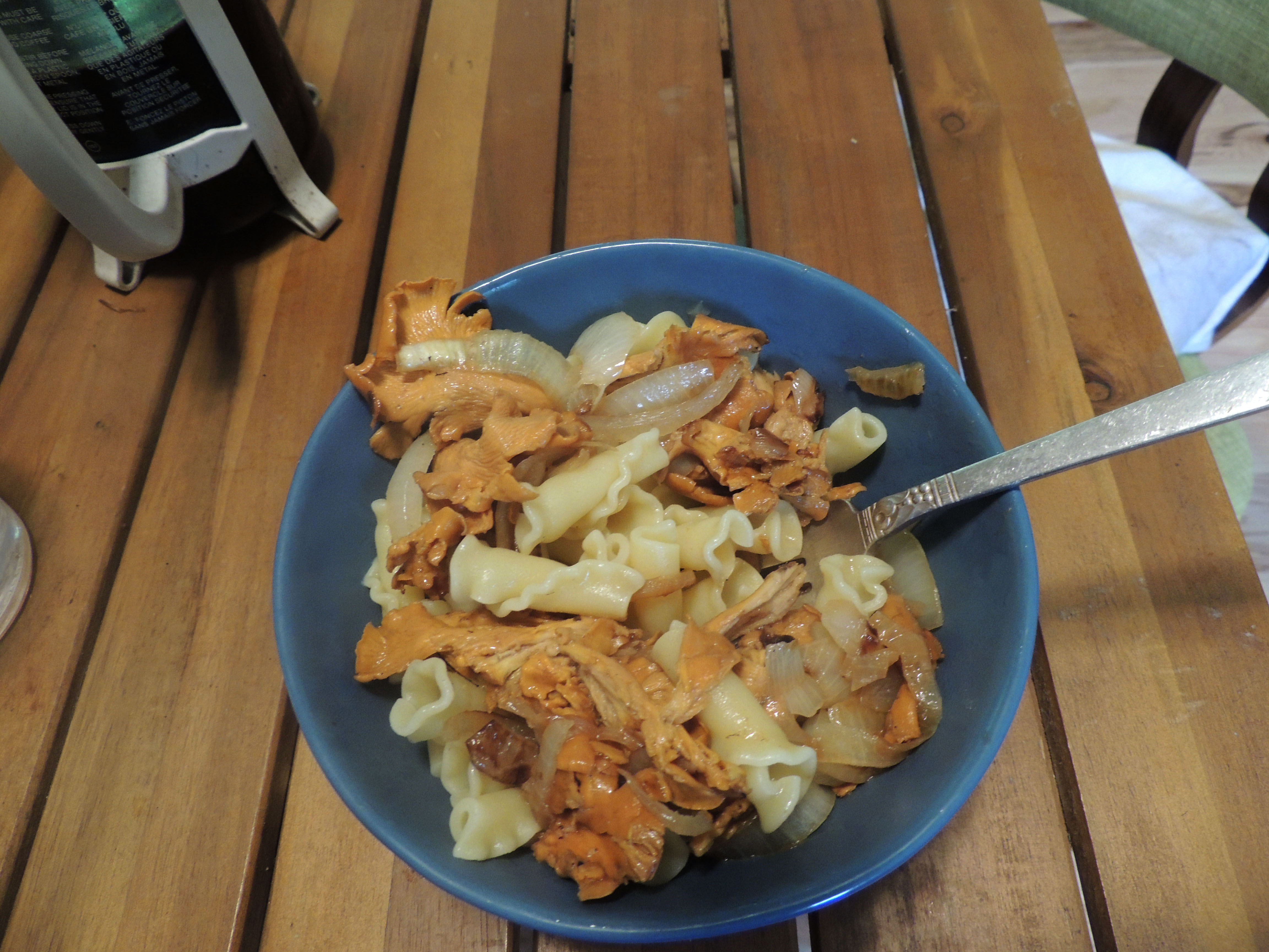 Up at the cabin, I cooked up a box of campanelle pasta while frying a pan containing nothing but a chopped up onion, some oil, a dash of salt, and the chanterelles I'd recently gathered. I ended up eating this with the pasta and no salt at all and it was perfect that way. It was a gentle comfort food and I went back for thirds when I ate it for lupper. (Gretchen doesn't eat foraged mushrooms, so she maybe found something else to do with the pasta.)