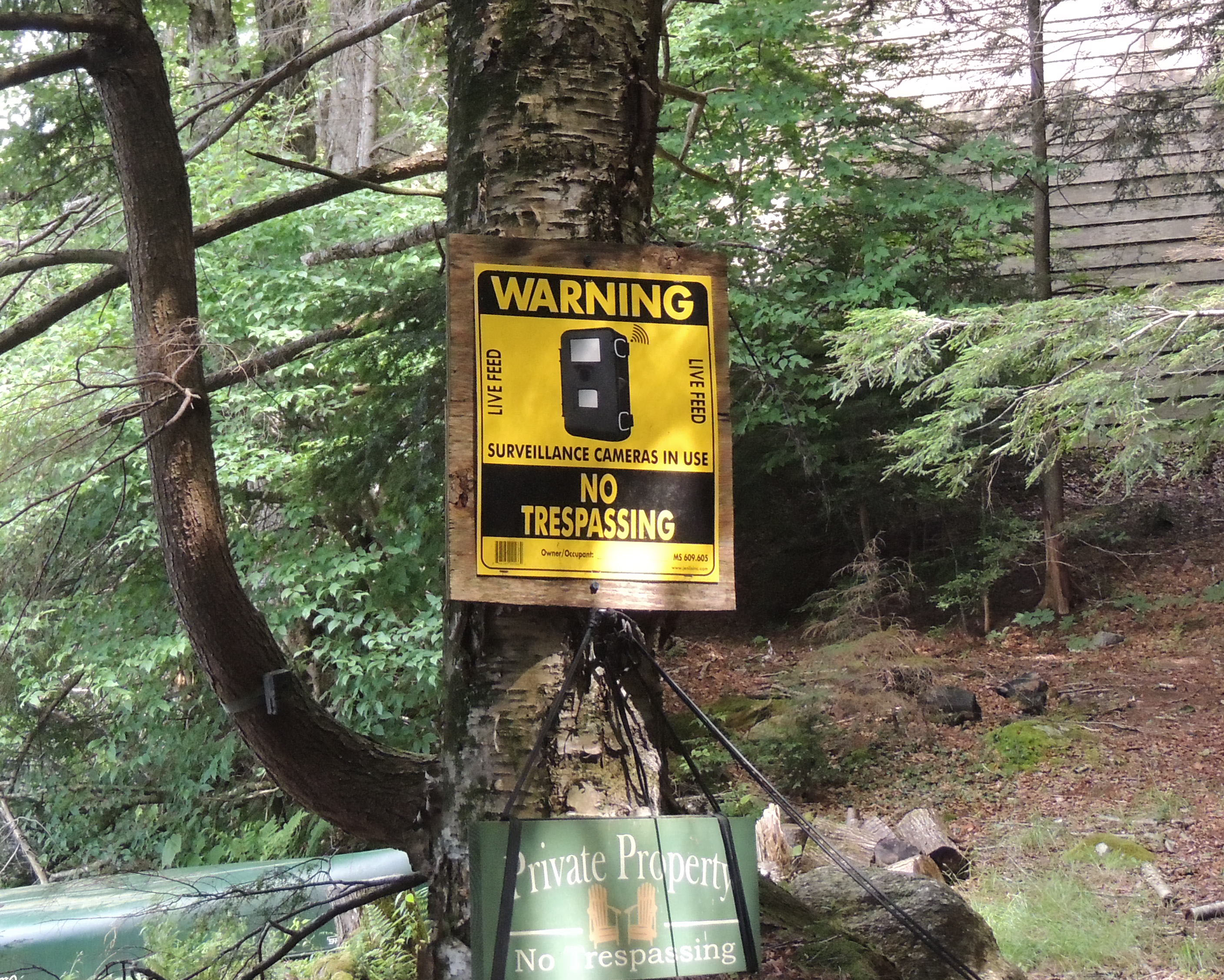 The parcel just north of the public dock has a rope boundary with all this stupid surveillance signage. You can see the trailcam they are using, which is definitely not sending any live feed to any cloud. Click to enlarge.