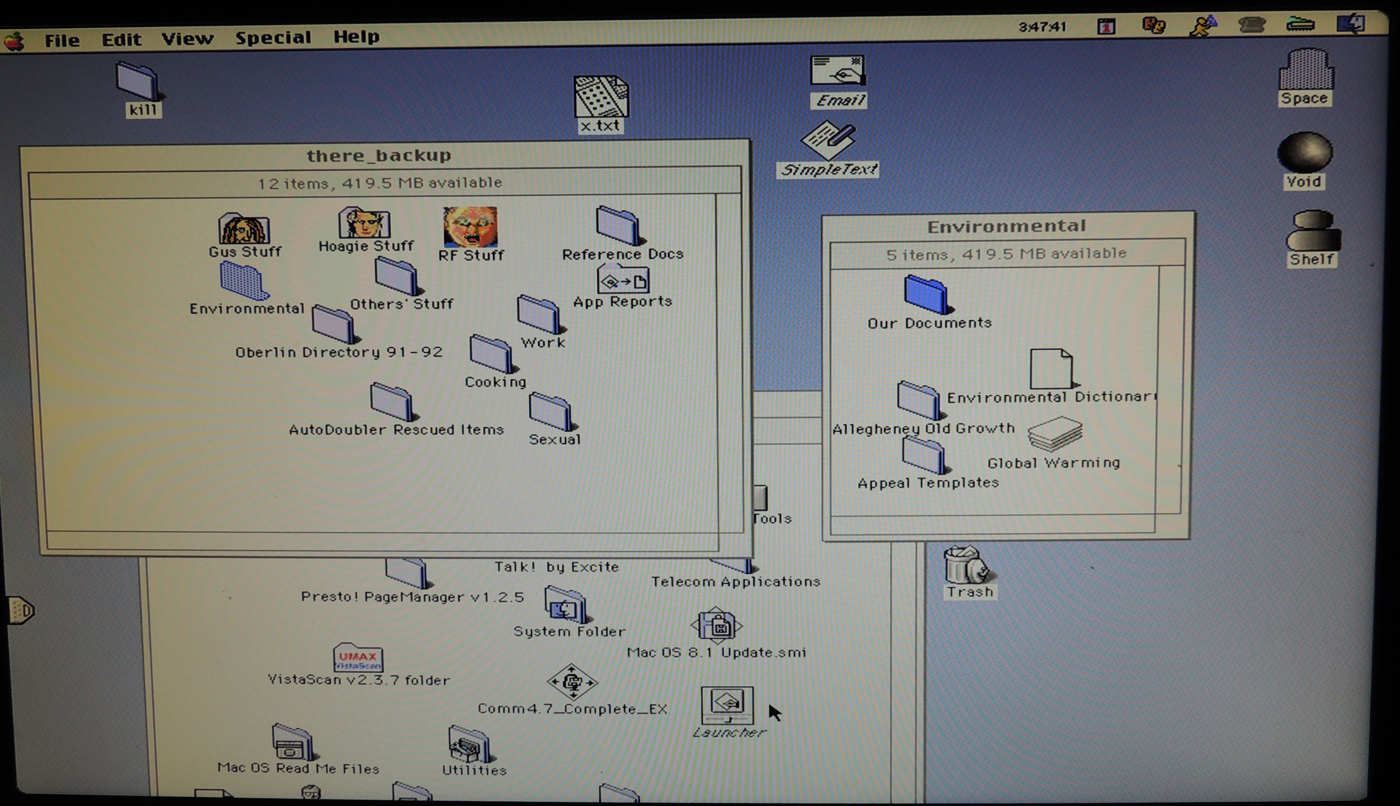 But when I finally hooked that old Macintosh up to the auxillary electronics needed to connect it to a modern monitor and PS/2 peripherals and initiated its first boot in decades, it sounded a satisfying full-throated boot chord, made all the richer due to the subwoofer contained within the Macintosh itself. It wasn't long before I was sucked into the nostalgia. That computers was, it turned out, a time capsule of my early-1990s computer experience. It contained essentially the modified direct clone of the setup that had been on my old Macintosh IIsi, which was in turn a modified direct clone of a setup that had been on a Macintosh SE dating to 1990, the first computer I'd had since the Commodore 128 and VIC-20 of my teenage years. The Power Macintosh, despite its name, took forever to boot, but once it did, all that great software was still there, complete with my many customizations. I'd even made customized folder icons for Hoagie, my father, and me. I fired up the carefully customized ResEdit I'd used to crack all that software I'd copied to a portable SCSI drive, and it worked just as well as it had when I'd spent hours a day using it back in the years before I had access to the internet. The upshot of all this is that I am very happy I brought that computer back to Hurley with me.