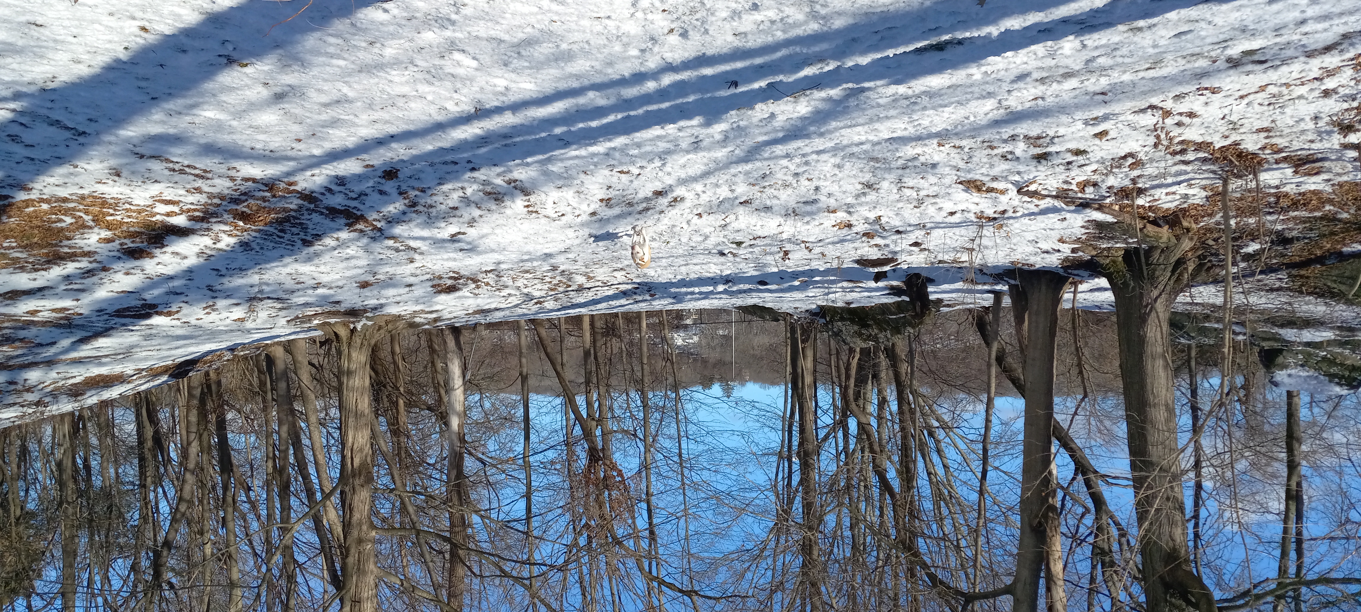 This morning Gretchen and I both had our respective coffees and briefly played Spelling Bee in front of the a woodstove fire in the living room. But then we had to convoy to VanKleeck's to drop off our Chevy Bolt to get new tires, an inspection, and all that. After dropping off the Bolt, Gretchen drove us through a previously-unknown redneck suburb of Kingston on Tuytenbridge Road to get over to 9W south and ultimately the park at Kingston Point. The plan was to walk the dogs there to give them a little change of scenery. Conditions were sunny but cold, with a face-freezing wind at the dog park at the top of the hill. There were no other dogs (or humans), but we let Charlotte and Neville run around in there anyway so they could check their "peemail." Then we walked down to very near the Hudson itself, where we found a segment of still-functional railroad track, kept in service to support a short trolley line starting near the Roundout. The wind wasn't as bleak down there, and we were able to walk about 800 feet before turning around and heading back. Along the way we passed a large flock of mallard ducks, who swam away from us quacking among themselves. Our dogs saw them but somehow knew it was pointless to chase after them.