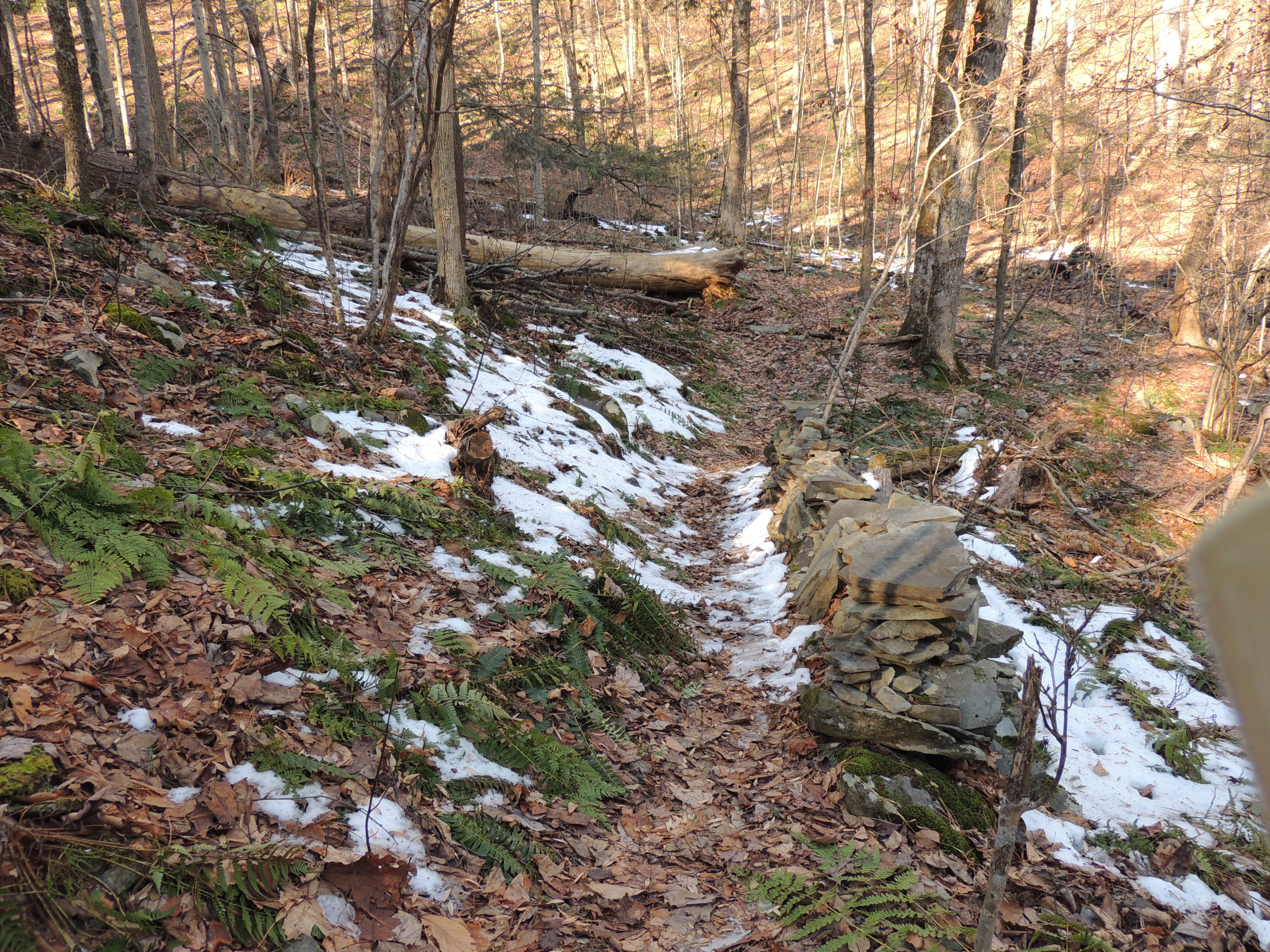 Crazy Dave's stone wall, which runs just downslope (east of) the path to his cottage just south of where it crosses the Chamomile. Note the remnants of the early December snows after a recent thaw. Here we are looking north. Click to enlarge.