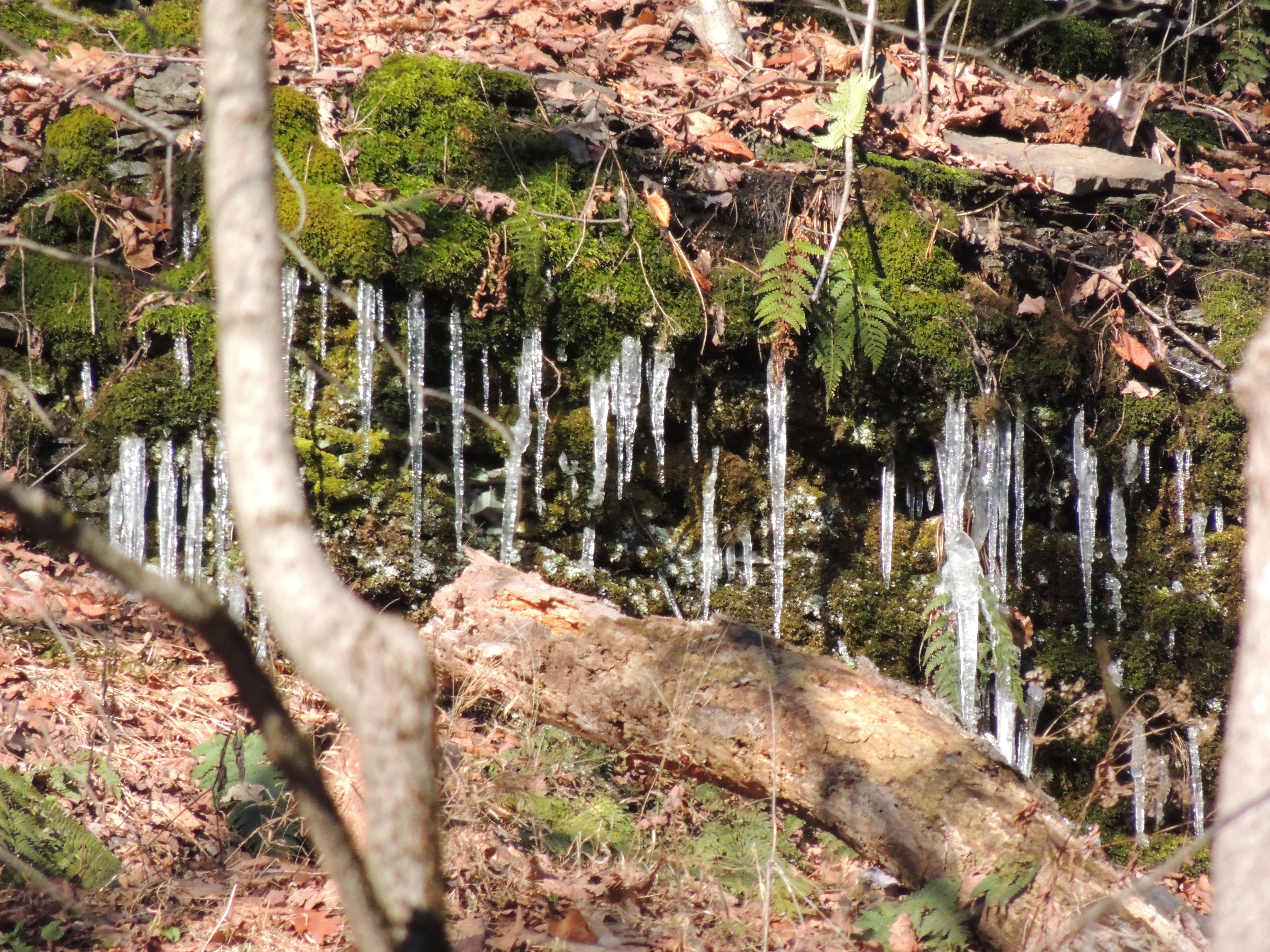 Icicles on the escarpment below (and south of) our house, viewed from the bottom of the gorge separating our parcel from that of our downhill neighbors (and Crazy Dave). Click to enlarge.