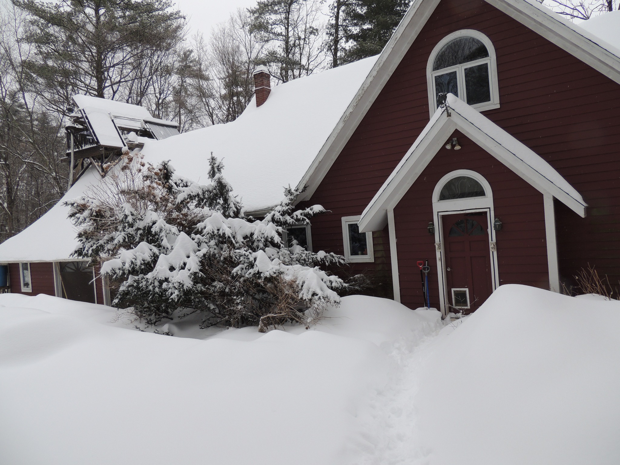So much snow had fallen in the snowstorm that the bookstore in Woodstock was closed and Gretchen didn't have to go in, something that almost never happens. We drank coffee and did the usual weekend morning thing instead, but not for long because Gretchen thought we should get going on digging out the driveway. But she also wondered if maybe we should just hire a snowplow, assuming we could find one available (unlikely). I decided to just start shoveling and see how it went. So I got some YouTube audio playing on my headphones and started ot shovel. I first dug a path from the front door to the cars, and then I continued out to Dug Hill Road, where I once more dug through the ice wall created by the snowplow. The digging we'd done yesterday afternoon was still evident, but it had been smoothed into a set of gentle undulations. Interestingly, the snow didn't seem any deeper than it had when I'd measured it last night even though it had snowed for much of the night afterwards. When I finally got around to measuring it, the total depth was only 15 inches, meaning that it had compactified on its own. This morning a gentle freezing rain seemed to have been falling, and it had put a very thin crust on the snow's surface and left a very thing veneer of ice on the forsythias.