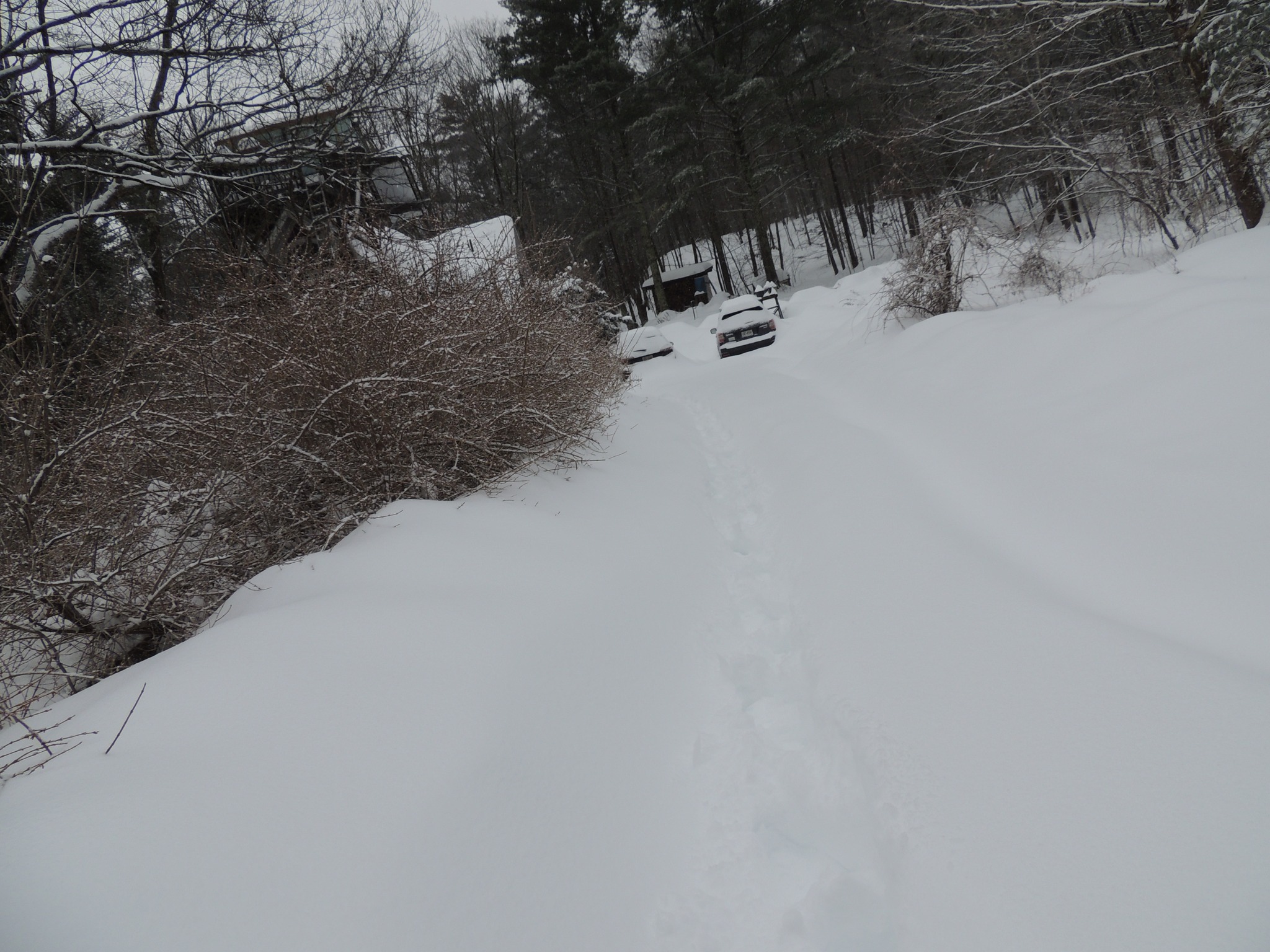 Looking away from Dug Hill Road before we started shoveling. Note the shallow trench showing where Gretchen had shoveled yesterday afternoon. We're looking south. Click to enlarge.
