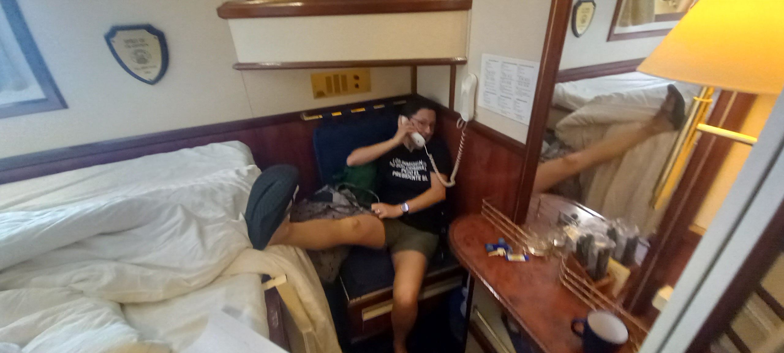 Gretchen on our cabin's phone this morning. In the absence of always-on internet, this was a surprisingly useful communication device, usually used to call Kelly & Brian's cabin. Click to enlarge.