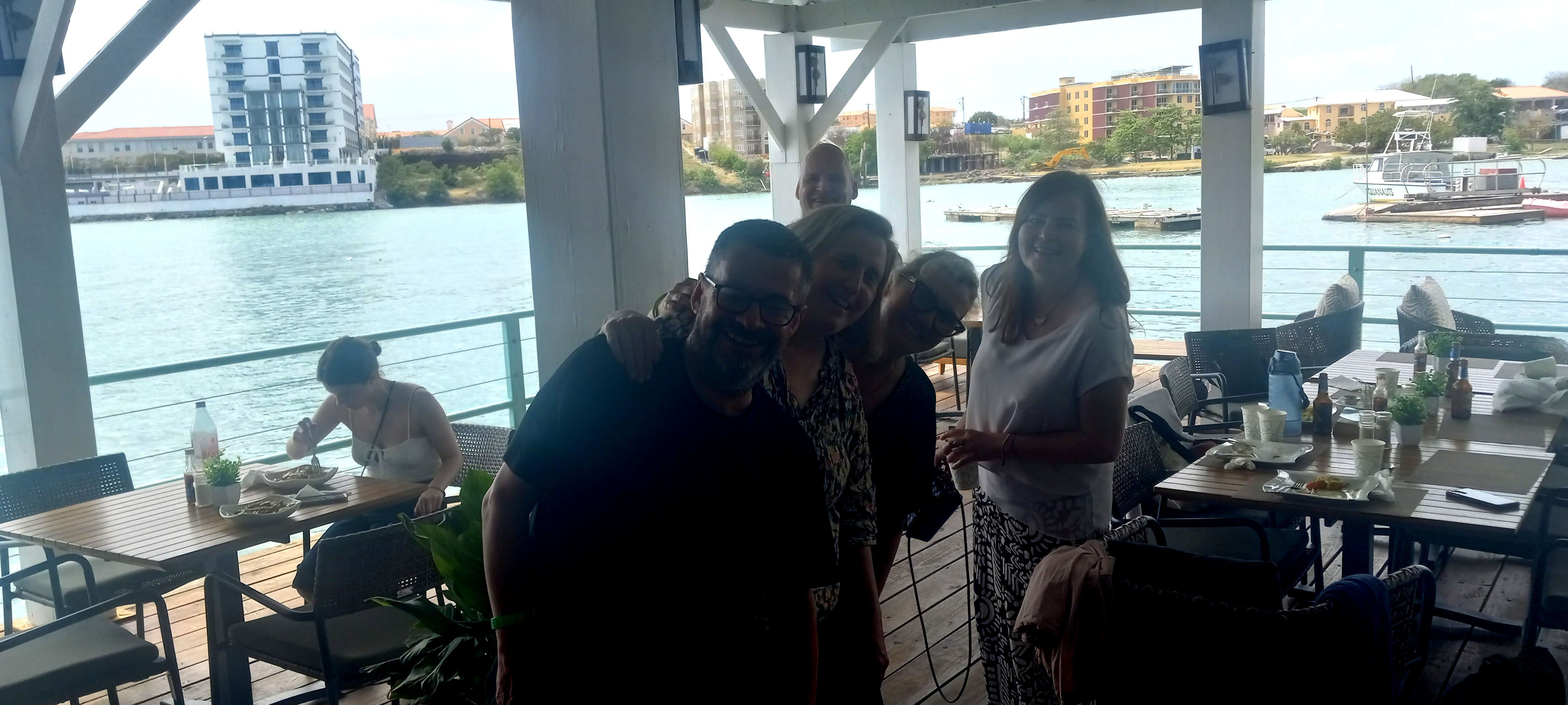 Not a great picture of our friends as we were leaving the Dodgy Dock Restaurant for the Grenada airport. From left: Angel (by herself), Brian, Kelly, Cathy, and Tara. In the way back there is Simon. Click to enlarge.