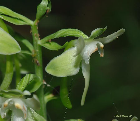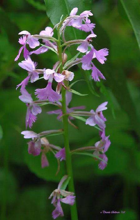 On entering the Cow Pasture Trail, the forest is similar to that described above, except for details. Successively noted were the liverwort Bazzania trilobataon tree bases, seedlings of Fraser Magnolia, Mountain Ash, six-inch (15 cm) fish in a trail-side ditch, abundant New York Fern, the manna grasses Glyceria striata and G. melicaria, Great Rhododendron on the ditch bank with Intermediate Shield Fern, the call of a Hermit Thrush (Catharus guttata), an Amanita fungus, Foam Flower, unidentified species of Atrichum and Mniummosses, then canada Mayflower, Blue Monkshood (Aconitum uncinatum), seedlings of Beech, Partridge Berry and six inch high Spruce and Hemlock seedlings.