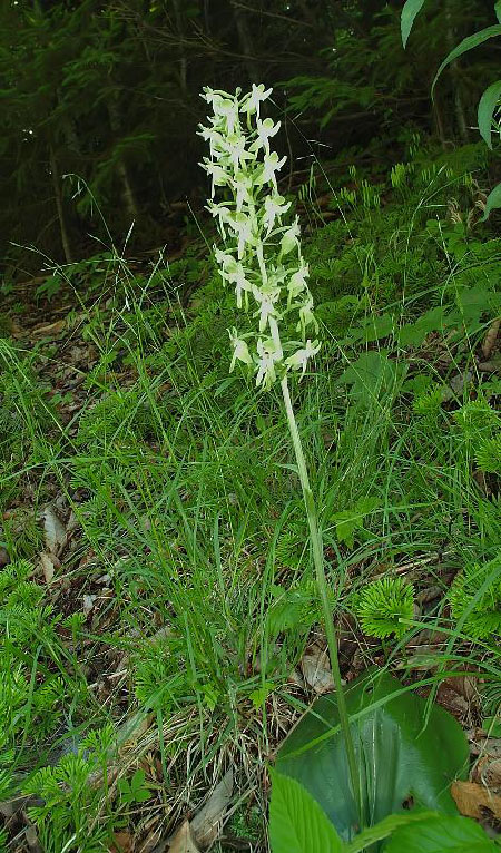 The first leg of our traverse essentially followed the 3600 (1098 m) contour southeast for about 0.5 mile (0.8 km). The canopy at the start consisted of Hemlock, Beech, yellow and Black Birches, Red Maple, Black Cherry of good form, White Ash, Northern Red Oak and a few American Basswood. The understory was dominated by Striped Maple, with some Hophornbeam and a few Red Spruce saplings. Although there were few shrubs, Hobblebush and Beaked Hazelnut were present. Intermediate Shield Fern was abundant, as was Shining Clubmoss and Partridge Berry. Other herbs were Round-leaf Violet, Carex debilis, Pink Ladyslipper (Cypripedium acaule), White Wood Sorrel, Medeola, Tree Clubmoss, New York Fern and Large Round-leaf Orchis (Habenaria orbiculata), all in all a strongly acidiphile community.