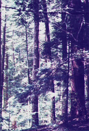 The initial impression on entering the grove is of a forest dominated by very mature if not old growth Hemlock (Tsuga canadensis). While the Hemlock are impressively tall, their girths do not compare with some old growth specimens in other locales, as in Cathedral State Park for example. Generally they do not much exceed 3 feet (0.9 meters) dbh. Along the interior stream bottom the Hemlocks share dominance with Beech ( Fagus grandifolia ), Sugar and Red Maples (Acer saccharum and S. rubrum ), Yellow and Black Birches ( Betula alleghaniensis and B. lenta), White and Northern Red Oaks (Quercus alba and Q. rubra), White Ash (Fraxinus americana), American Basswood (Tilia americana) and Black Cherry (Prunus serotina). A striking feature is the abundance of large dead snags, dead falls and large woody debris. Debris dams are common in the stream, which flows over a rocky bed of layered sandstone. While the understory and shrub layer are sparse along the stream bottom, there is some Striped Maple (Acer pensylvanicum), Alternate-leaf Dogwood (Cornus alternifolia) and Hobblebush (Viburnum alnifolium ). A few Mountain Ash (Pyrus americana ) seedlings were also noted. While Hemlock dominates in this bottom, there are few seedlings or saplings of the species and the same is also true of Red Spruce (Picea rubens), which occurs elsewhere in the Grove. As in other old growth Hemlock forests, there is an aura here of cool serenity without gloom and a pervasive odor of mouldering wood and fungi that is the essence of the slow uninterrupted slide toward equilibrium between the organic and mineral worlds.