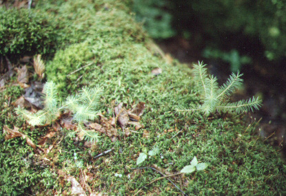 The terrain in the vicinity of our camp appeared to consist of two types , conglomeratic sandstone to the west and weak, likely shale-dominated rock to the east on a flat spur top. The canopy on both terrain types near our camp appeared to be dominated by Red Spruce as well as the same deciduous species as are present in the Scenic Area. Red Spruce saplings and large seedlings were abundant and vigorous appearing, but small seedlings that reflect current reproduction, were hard to find and virtually confined to down bole "nurse trees". An attempt was also made to find White Ash and/or its seedlings, but without success. Extraordinarily abundant here was Shining Clubmoss as well as blooming Partridge Berry and very vigorous appearing Sweet-scented Bedstraw. Leaders of Red Spruce in the open showed new growth increments of up to a foot (0.3 m) or more, but those in the understory exhibited much less.