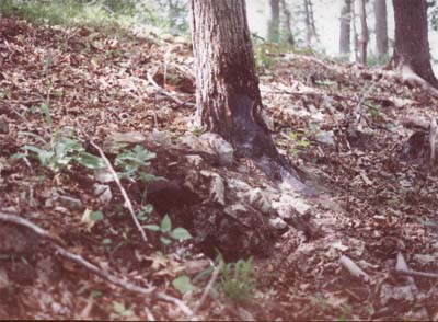 Soils here appear to be generally moist. A sample (3) was taken from a 2-3 inch depth at the highest point on a nearly flat aspect. This soil had a low density as a result of a high percentage of organic matter, was moist and almost black in color. However, it contained many small rock fragments. An initial pH value of 5.2 was obtained for this soil, but after 24 hours this had increased to 6.2, perhaps as a result of included carbonate fragments. The soil temperature ( T-62) taken at a 5 inch depth was T=12.5 deg C. Immediately down- slope to the southeast of the highest point we saw a large (20 inch / 0.5 m) dbh multistemmed White Basswood (Tilia heterophylla), Black Oak and Black Maple, with the latter the likely source of the seedlings first identified by R. Hunsucker along the spur to the north. Also present down –slope were young Tuliptree and a dense ground cover dominated by sedges that includedCarex canoidea, C. digitalis, C laxiflora, C.. communis, C. platyphylla, C. pensylvanica and C. cephalophora. Other species noted on this slope were Redbud (Cercis canadensis), Cleavers (Galium aperine), Carrion Flower (Smilax herbacea), a little Intermediate Shield Fern (Dryopteris intermedia), Smooth Sweet Cicely (Osmorhiza longistylis), Wild Liquorice (Galium circaezans), the grass Brchyelytrum erectum, abundant Black Cohosh and the edible fungus Tricholomopsis platyphylla ("Platterfull") . Both seedlings and saplings, as well as large trees of Black Maple were common. In one case a large Black Maple extended its roots into an ash gray "rotten" sandstone which effervesced to acid, and thus proved to be calcareous. The base of this tree, as well as others, showed evidence of fire in the form of blackening and scarring, and were accompanied by partially burned down wood. It should also be mentioned that the leaves of some Maples here bore resemblances to those of both Sugar and Black Maples.