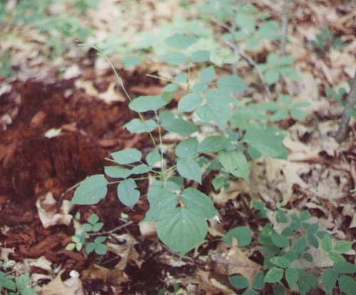 We now crossed the main road that paralleled the Hill. Below this road the slope steepened greatly and on this slope grew abundant Desmodium glutinosum, a tick trefoilassociated with nutrient-rich soils, as well as other mesic herbs, the presence of which we at first attributed to "road wash". However, these did not diminish in abundance down-slope, where we successively noted Virginia Snakeroot (Aristolochia serpentaria ), Palmate-leaved Violet (Viola palmata ) ,Great Chickweed (Stellaria pubera ), Hog Peanut (Amphicarpa bracteata ), the grass Panicum boscii, Black Cohosh (Cimicifuga racemosa ), Wild Comfrey (Cynoglossum virginianum ), White Snakeroot (Eupatorium rugosum ) and Variable Panic Grass ( Panicum commutatum ) .