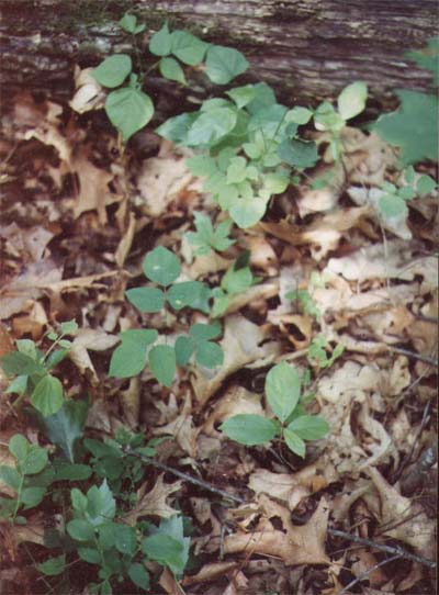 The forest floor bears a very heavy leaf mat, which contributes to the dominance also of woody species in the low ground cover. These include Upland Low Blueberry (Vaccinium pallidum ), a little Deer Berry (V. stamineum ), Witch Hazel, Pinxter Azalea (Rhododendron nudiflorum )., Corymbose Spiraea (Spiraea corymbosa ), as well as many seedlings of Red Maple, Black Gum, Sassafras, azalea and less of oaks and hickories. While herbs were scarce, Four- leaved Yam ( Dioscorea quternata) and the tick trefoil Desmodium nudiflorum were fairly common. Others of rarer occurrence were Hairy Angelica (Angelica veninosa ) the orchid Whorled Pogonia ( Isotria verticillata ), Moccasin Flower (Cypripedium acaule ), Indian Pipe (Monotropa uniflora ), Wreath Goldenrod (Solidago caesia ), Calico Aster (Aster lateriflorus ), Mountain Bellwort ( Uvularia pudica ), Poverty Oat Grass (Danthonia spicata ), Bracken Fern (Pteridium aquilinum) and Smooth and Hairy Sweet Cicelies (Osmorhiza longistylis and O. claytoni ) . As a consequence of the heavy leaf mat, many of the herbs as well as bryophytes were concentrated at tree bases where they could also benefit from the moisture and nutrients produced by trunk run-off. Additional habitat for bryophytes was also provided by living tree trunks, down wood and scattered sandstone blocks and outcrops. The most conspicuous bryophytes observed were the mosses Thuidium delicatulum, Dicranum scoparium and Leucobryum glaucum. While down boles bore a variety of bryophytes, the degree of cover of these boles was patchy due to the dry conditions in this forest. Fire scars were quite common, particularly on the bases of the larger Black Gum.
