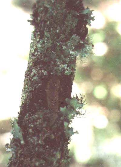 Our 6 – 15 – 01 traverse around the sinkhole began in mid-morning and extended counterclockwise from the east side, First noted in the ericaceous oak forest was a fragment of an unidentified Pseudevernia lichen that had fallen from the canopy. Generally however, macrolichens on tree trunks were quite sparse here. Following this we recorded a 20 inch (0.5 m) dbh White Oak and, on a down bole, the fungus Marasmius rotula and the mosses Platygyrium repens and an unidentified species of Brachythecium. Also present were Black Oak and seedlings of Flowering Dogwood. Of special interest was the occurrence of the two major species of tick trefoil (Desmodium ) . While D. nudiflorum and other acidiphiles such as Upland Low Blueberry prevailed in the heavy leaf mat of the oak leaves, D. glutinosum was restricted to the proximity of rotting down boles, so a steep gradient in pH appeared to exist around at least some of the decaying wood. This inference was confirmed in one case by taking a soil sample (# 3 ), consisting mostly of coarse, reddish-brown humus with little mineral matter, from the base of a completely decayed stump, on which grew a large plant of D. glutinosum. The result was an initial pH of 6.4 for this sample, and 24 hours later this had increased to pH= 7.6.