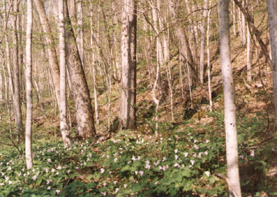 Moving west on the terrace and parallel to the stream bank, we encountered a dramatic change in the flora and a great increase in undergrowth. This undergrowth included Paw Paw, Black Locust, Muscletree, Coral Berry, Poison Ivy, White Wood Aster, Cutleaf Toothwort in seed, Black Cohosh, Meadow Garlic (Allium canadense) , the trout lily Erythronium americanum (as distinguished from E. umbilicatum found on the terrace above ), Common Many Knees and Wild Stonecrop. The undergrowth was accompanied by very little moss but an unidentified species of Atrichum. Just above, on the lower slope, stood a large Sugar Maple, its base heavily covered by a species of Anomodon moss and Wild Stonecrop. In summary, this community appeared to bespeak a rich soil. In appearance a sample of this soil (no 7) taken here at a depth of 2-3 inches, was similar to the previous sample. However, given the observed flora, it came as a surprise that it also had a pH of 4.5 both initially and 24 hours later. It may be that this sample was not representative of soil dominating the root zone , although this flora is not necessarily excluded at this pH.