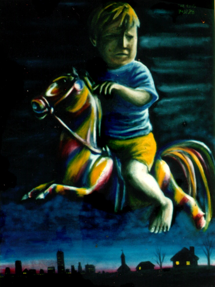 The horse in the basement was special and obedient. He would wait for me to come down those dangerous stairs to the world that I owned, and no matter what had happened, or what I feared soon would, the horse would do as I commanded, take me where I wanted to go, and no one could contravene our alliance. Until one day my mother gave the horse away. She promised me that in the land we would be moving to there would be real horses. But I never found real horses as interesting and as spontaneous as the old horse in the basement. Real horses had to be brushed and carefully outfitted before they could be ridden. Then they simply walked about on the ground and tried their best to do only as they pleased. They never flew above the cities or swam across the seas to far off lands where animals keep nature safe from the uses of man.