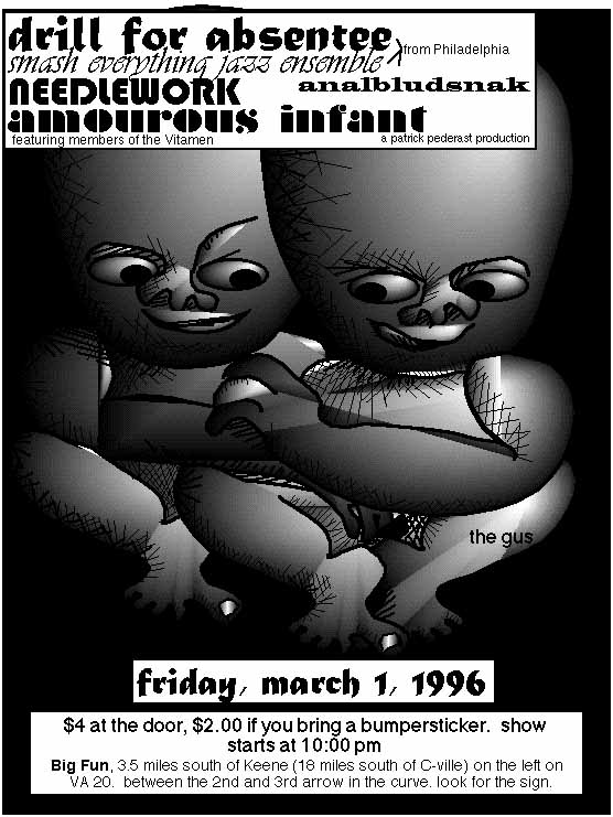 Drill for Absentee-a very loud, atonal, and rhythmically nonstandard band performing music something like that of the Nation of Ulysses. Michæl Nace, a good Catholic boy, is the singer/guitarist for this what otherwise might be mistaken for band-spawned-by-Satan. By far the closest thing to redeeming value to be found in the infamous house warming party was the performance of Drill for Absentee.