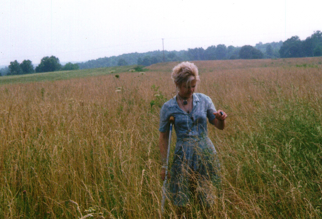 Jessika in the Big Fun front yard, July 1996. In the waning days of Big Fun, when there was no electricity and no running water, and thus no way to flush the toilets, this constituted Big Fun's principle bathroom. Photo by Deya. Click picture for a bigger version. |