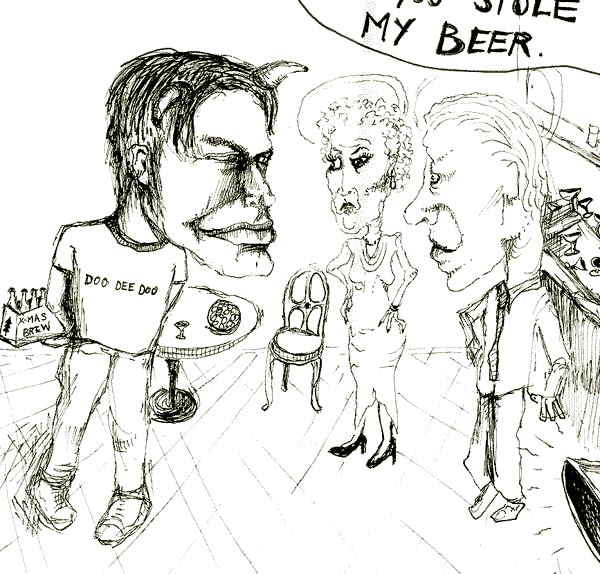 Back at the House, where heat pours forth with stinginess but the spirit issues forth copiously, we sat laughing and joking at the expense of The Gathering. By now, Jennn and Michæl Nace were in agreement that my botched beer theft had been a very cool thing indeed. If nothing else, it made a wonderful story, on the scale of other excellent stories I've heard or told (examples being The Hit Man of Johnny Boom Boom Mancini , The Chicken Experiment, The Stalking of Andrew Faust, and A Somewhat Fictionalized Account Of The Goings On Between Jim Eriqicker And Eriq Schliqer During The Fall Of 1993). We drank stolen beers to celebrate the evening's fun. Even Michæl Nace, despite his temperate tendencies, drank one of the hard-won Christmas Brew®s (manufactured by Anheuser Busch, St. Louis Missouri). For Jennn, perhaps the excitement even had a hand in ameliorating some of the misery resulting from Farrell's failure to show up at the Jehu End of the World Party. The score for Farrell: two disses in two nights.