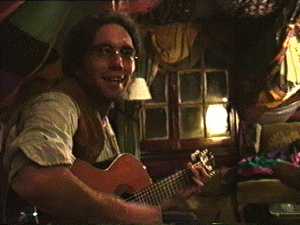 Jamie Dyer turned up, and soon he'd secured permission to play a very fine acoustic guitar that was there. His first song was very good, and like several of his songs, I recorded it all on video tape. The lyrics, to a bouncy rhythm, went like this: