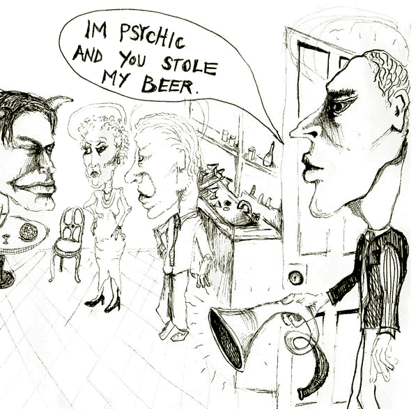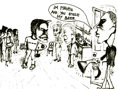 The cult member, however, met my joviality with a stern visage. He accused me of stealing his beers and he demanded to know where I put them. I asked what he was talking about. "Beers? What beers? What are you talking about?" That sort of thing. The guy with the horn convincingly stated that he had mental telepathy and that is how he knew I'd stolen the beers. Soon there were other cult members standing in front of me in a semi-circle, taking turns accusing me of grand beer theft and trying to find out with whom I had come and with whom I intended to leave. I wasn't proving very co-operative, however, since I didn't claim to have any knowledge of the beers and I stated that I didn't have to tell them who I'd come with and who I'd be leaving with. I said that this was a party....I could leave with anyone. One of the cult members whispered in my ear and asked if I was really drunk. Somehow, I managed to hijack this subconversation and divert it to the subject of Astrology. I guessed he was a Scorpio. But he wasn't. He wasn't even a water sign. Irregardless, he seemed to be enjoying the Astrology conversation much more than the confrontation over allegedly stolen beers, and it was with a start that he realized that he'd been manipulated into talking about Astrology. He said, "You really think you're cute, don't you." I still had the expensive golden ladle in my hand and waved it as though it were a blue Munchkin Pole, saying, "Of course I'm cute! I'm a little munchkin!" This was perhaps the most memorable quote of the whole evening. Without knowing the context from which it had come, it must have caused delicious puzzlement to the self righteous cult members who pressed ever closer. One lady pressed her forefinger hard into the middle of my chest, claiming she knew murderers, thieves, drug dealers, all kinds. Thus she knew all about the likes of me. I learned later that she was the head of the Florida Prison system. God knows, I had to be bad if she thought so. Someone quizzed me about where I was from. "Staunton," I said matter-of-factly. (Michæl Nace told me later that it seemed I developed almost a "good ole boy" accent as I gave the name of my town, and it made me seem overly snide given my weak position in this confrontation.) One of the cult members took the ladle from my hand as I commented on the beauty of it. He said something to the effect that I'd probably never had any experience with anything so classy as that ladle before. Following this logic, I heartily agreed, saying "I come from the wrong side of the tracks." Since they obviously were not going to have any satisfaction interrogating me, the cult members turned their attention to my friends in the kitchen (and everyone I knew was there). To one such question, Sara admitted "I know him, sort of." She had been seen interacting with me all evening and it would have been difficult to deny that she knew me. Finally, though, real ice was broken when Josh Smith admitted I'd come with him. Now all attention shifted to Josh. In what car had we come in? So Michæl Nace broke down and announced that I'd come in his car. Would it be okay, the cult members asked, if they checked his car? Sure, there didn't seem to be a problem with that, so out they went to check the car. That's when the nervous wait commenced. Who really knew what would be found at the car except me...and I didn't know exactly how it would go down. I thought maybe it would be a good idea if I could discretely vanish or something (that is a capability I have no matter where I go). But as I was going towards the door, a tall guy with an old face said in a kind voice that maybe we should just wait until the others returned from checking the car.