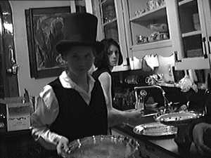 Peggy and Sara cleaning up in the waning moments of the party. The fun is only just about to start, but this is the end of my video taping for the evening. The Girls continue to bustle around, and I was doing my best to provide entertainment. A couple of friendly cult members materialized in the kitchen and I engaged them in a little friendly drunken conversation. I asked them if they'd ever talked to a nazi skin head of late. Then, without pausing, I said that nazi skinheads hold that the conventional view of the Vikings, that they had horns on their helmets, is just a vicious rumour started by namby-pamby and too-often pillaged Christian Europeans to paint the Vikings as satanists. I said that upon learning that the Vikings did not actually have horns on their helmets, I lost all interest in them. All day, to Jessika especially, I'd been saying that I hate horns in music but I love them on the heads of animals or the helmets of Vikings.