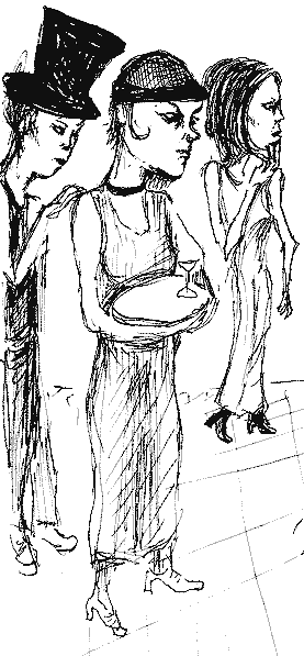 We were our usual odd sight. I didn't have Jessika's blue wig on, but I was wearing my long hooded black wool The Gap Trenchcoat and my oddly worn black steel toed boots. And Jessika was wearing the same coppery lacy dress she'd worn at the Jehu End of the World Party, only she'd put it on inside out so the sheer silkiness of the inside, all irregular in colour from bad dry cleaning, was visible in its own alluring ridiculousness. We passed a boot store, and a solitary man, looking at the window display, turned to see us, and gave us a curt acknowledgment to our reflexive hellos. He was one of the The Gathering cult members! What bad luck, for Jessika to be seen with me the very next day. Now they'd all know that she was a mere servant of Satan.