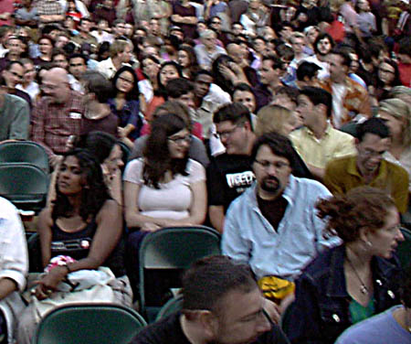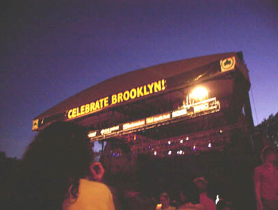I wandered around for awhile, flowing with the various rivers of humanity, hoping to run into somebody I knew. I was down near the front in the area featuring genuine Celebrate Brooklyn folding chairs when someone called out my name. It was Ray, and there he was with his posse. He had a couple of open seats right next to him reserved for two members of his posse who never returned to reclaim them, so I sat down.