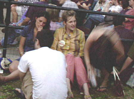 Once I'd returned to the bandshell, I cased out the entrance gates to see what was being prohibited and whether bags were being searched. Not only were bags being searched, but I saw that videocameras weren't allowed. I'd brought my digital camera, and it looks enough like a videocamera that I expected the guards would give me shit. So I went in search of a place along the fence to hide my bag so I could retrieve it later. Then I came upon an isolated part of the fence where a guy suddenly and very matter-of-factly leapt over and disappeared into the teeming masses. His action had the effect of catalyzing a good half dozen imitators, all of whom where successful. But then that was it. I waited for awhile at the fence trying to muster the nerve to initiate another wave of good old American bum rush. After awhile, a group of bored-looking adolescent white boys showed up, and was it obvious to me that they were looking for a place to climb over the fence. So that was it, I jumped over (catching my wrist bracelet in the process) and vanished into the sea of heads. Looking back over my shoulder, I could see the teens leaping the fence like mountain goats. They weren't going to be out punk-rocked by an old fart like me.
