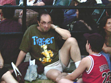 Later I rode with Sally across the Long Meadow over to the 9th Street bandshell where Yo La Tengo would be playing as part of a multi-week event known as Celebrate Brooklyn. Gretchen had told me about these Celebrate Brooklyn concerts and had led me to believe that it was appropriate to sit just outside the concert (since dogs aren't allowed inside). So I went and found myself a reasonably comfortable spot just outside the fence near the road in a narrow sliver with an imperfect view of the stage. I'd thought to bring a coffee mug containing rum, but I hadn't remembered water for Sally or a blanket to sit on. Looking around at the other people who were setting up near me, it was clear that I was the least prepared of any of them. That's how I always have been - the kid behind you in second grade who was always "borrowing" paper and pencils and who never did his homework. Oh yeah, and I was never very clean back then either.