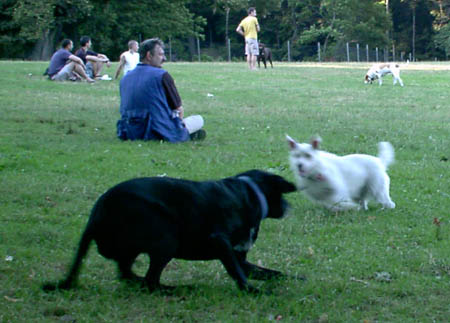 Prior to the Yo La Tengo show, I rode my bicycle with Sally out to the Nethermead (in the distant southeastern end of Prospect Park) where it is legal to have dogs off-leash after 5pm year-round. I sat under a tree and Sally sat nearby, on the lookout for squirrels who never materialized. Occasionally another dog would walk up to her making friendly overtures and she'd get annoyed and run it off. There was, however, one little white dog who was extremely persistent.