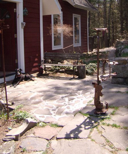 Today I was able to get the dashboard out of the Honda Civic hatchback after following some advice I found on the web. The key was to get the plastic off the ridge between the driver and passenger seats; the dashboard is braced here from behind. I'd already removed everything else holding it except for that one bolt hidden beneath a pop plate in the top middle of the dashboard. Once I had the dashboard out of the way, the heating system came out easily, allowing me to stockpile the heater core for some fun future hydronic project. I also thoroughly disassembled the dashboard itself, which left me with a delightful piece of found sculpture. It was the dashboard skeleton, a structure built of steel plates welded to a subtly bent steel pipe. I took this "sculpture" and place it front of the house, and it looked like something a not-entirely-clueless McMansion-dwelling homemaker might erect.