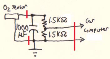 Next I checked the signal coming off the accursed Honda's post-cat oxygen sensor. This seemed to vary a lot more, ranging from 0.1 volts to nearly a whole volt. It seemed like it might be possible to fool the computer into thinking there was a working catalytic converter if I could do two things: stabilize the voltage (that would require a capacitor) and lower the voltage (that would require a voltage divider, or two resistors in series with a center tap between them).