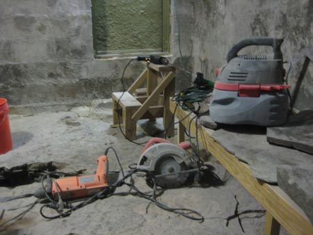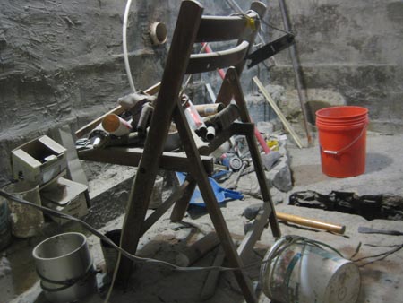 Rain fell for much of the day, complicating my work on the outhouse crapatorium. It's dangerous to operate 120 volt drilling equipment outside in a downpour, but at what level of rain is it safe to run such equipment? For me, that answer was "a medium drizzle." I initially tried avoiding 120 volt tools, but none of my battery-powered drills were up to the task of drilling 3/8 inch holes with a spade bit eight inches into two four by fours in preparation for a lag bolt. Between passing rain clouds, I managed to attach three large four-by-four horizontals between the corner pillars of the outhouse. These will support some of the internal structures of the outhouse, such as the place where one will sit down and initiate the movement of bowels.