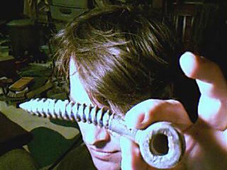 Up in the tree, the task of drilling all the way through the White Pine proved a much bigger job than had been the original three inch pilot hole (whose angry remains I reused). It turned out that the tree was about 14 inches thick at this point, some twenty feet above the ground.