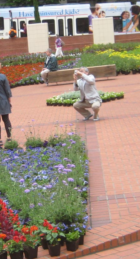 The weather had cleared out and sunny conditions prevailed, so this morning Gretchen and I drove to downtown Portland to walk around and then sit for awhile in café in the basement of Ecotrust, a "green building" with High Line-style plantings on its roof and balconies. Then we went over to Pioneer Square, a large outdoor amphitheare that, on this day, was decorated with hundreds of flowers still in their little plastic trays. Pioneer Square is widely regarded as Portland's "living room," though at lunch hour it's more of a dining room. Two different people (an older man and a younger woman who was probably a cross-dressing man) were standing in two different places dancing energetically to whatever was playing on their earbuds. I believe this is what the kids today refer to as a "silent disco."