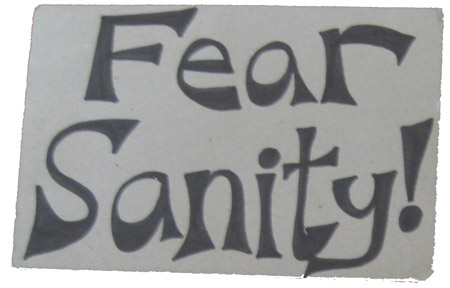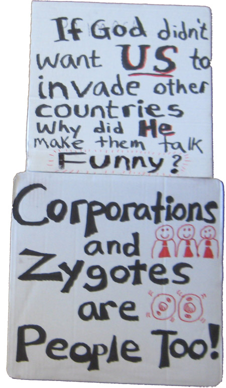 Before setting out for the Rally to Keep Fear Alive, I went down in the basement and found some cardboard and magic markers with which to make protest signs. The one I'd had in my brain for weeks was "Fear: because rational caution is never enough," so that was the first sign I made using the largest piece of cardboard. Since I had two other pieces of cardboard, I made another sign reading "Corporations and Zygotes are People Too!" (complete with stylized images in red ink depicting smiley-faced businessmen and jiggling single-cell humanoids). I gave the other sign possibility to Gretchen, who made a sign reading "Fear Sanity!" (though there would be others at the rally who'd made signs reading exactly the same thing).