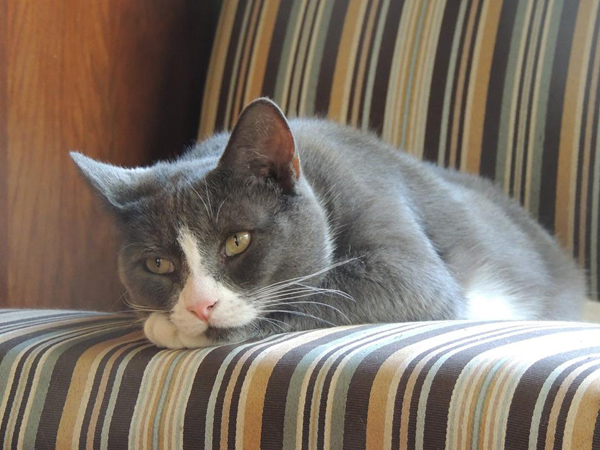 Celeste on a striped chair in the living room. She only likes to lie on firm furniture. (She doesn't like the bed.)