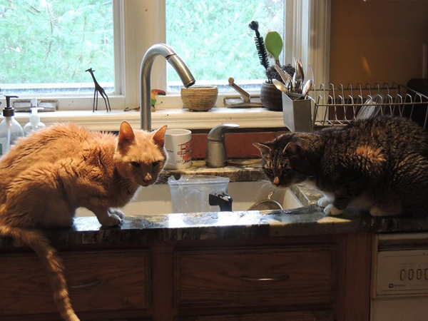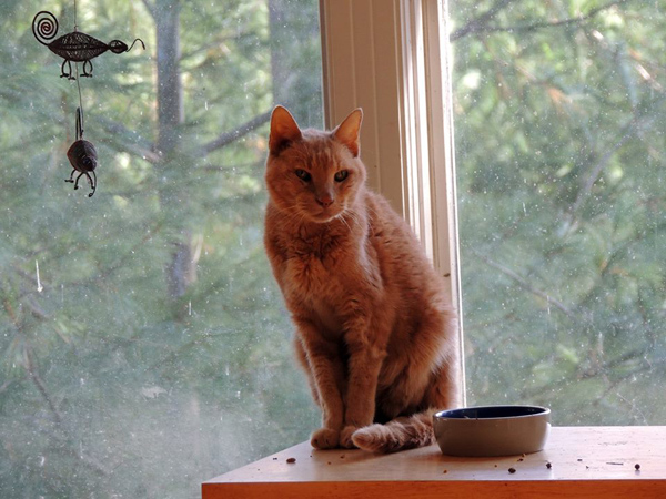 One of my Facebook friends saw the picture of Clarence and Charles at the sink and asked whether Clarence was sick. I said that he had "elderly cat wasting syndrome," but that we'd heard of a diet for cats with kidney failure that we might want to try. Another of my Facebook friends (the wife of the father of Allison's boyfriend, actually) said that she'd had a dog with this problem and that the solution was "high-carb" dogfood. Evidently some older creatures develop problems digesting protein and begin to waste away despite voracious appetites. The solution is to give them carbohydrates, which they can continue to process. As an experiment, I gave Clarence a piece of bread and was surprised to see him eat it. Back when I was a kid, I remember cats occasionally liking bread. But those cats were barn cats, the sort who aren't too fussy about food. Most of the cats in my life these days are fussy about their food and will only eat things that are substantially comprised of dead animals.
