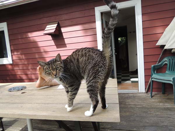 Charles and Gretchen's feet out on the east deck for Saturday morning coffee.